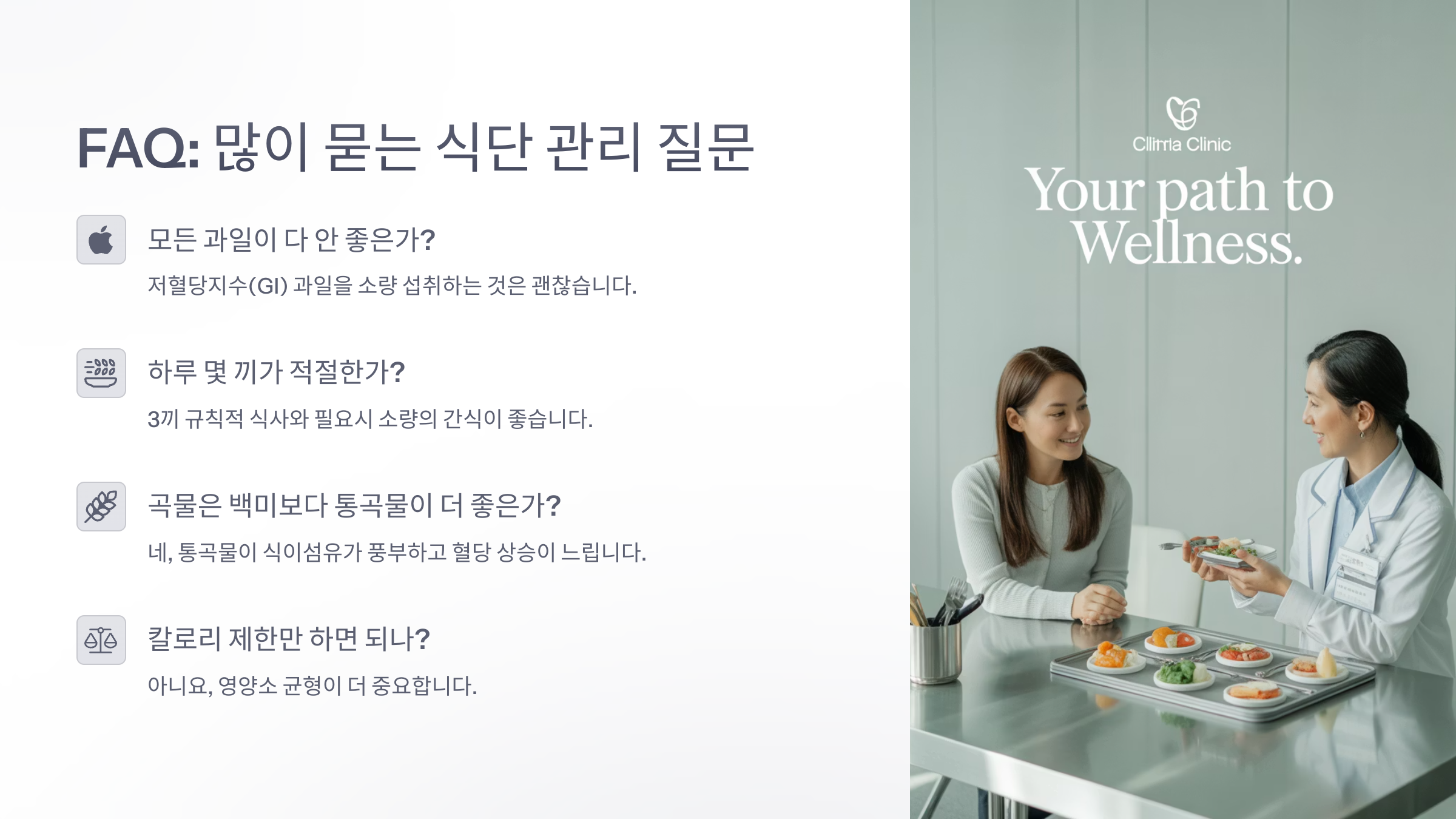 Q1. 당뇨 환자는 과일을 먹으면 안 되나요?A1. 아니에요! 혈당지수가 낮은 과일을 적당량 섭취하면 오히려 건강에 좋아요. 사과, 블루베리, 자몽 등이 추천돼요.