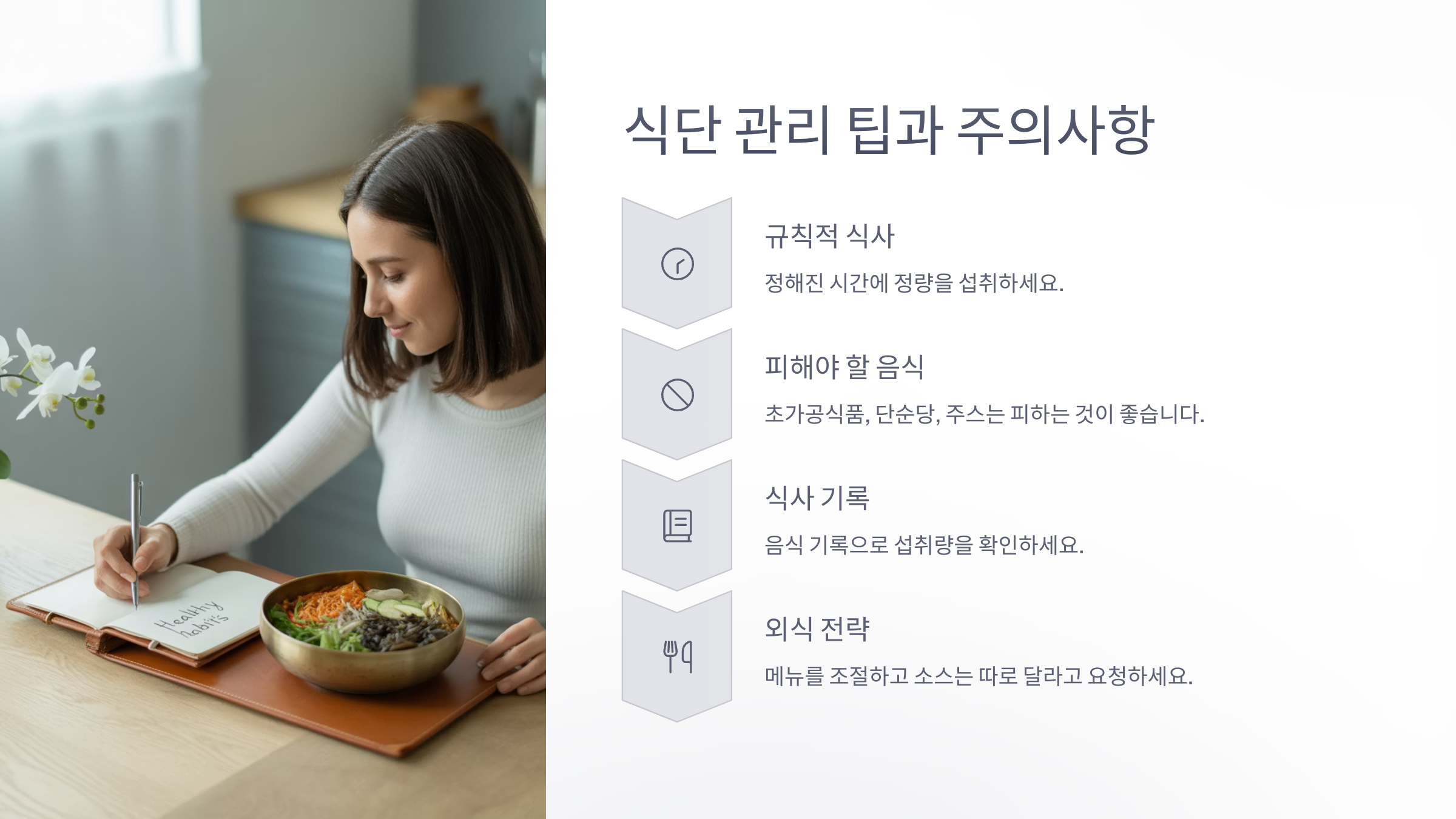 내가 생각했을 때 가장 중요한 건 '꾸준함'이에요. 가끔 철저하게 식단을 지키는 것보다, 매일 실천할 수 있는 습관을 만드는 게 장기적으로 더 효과적이에요!