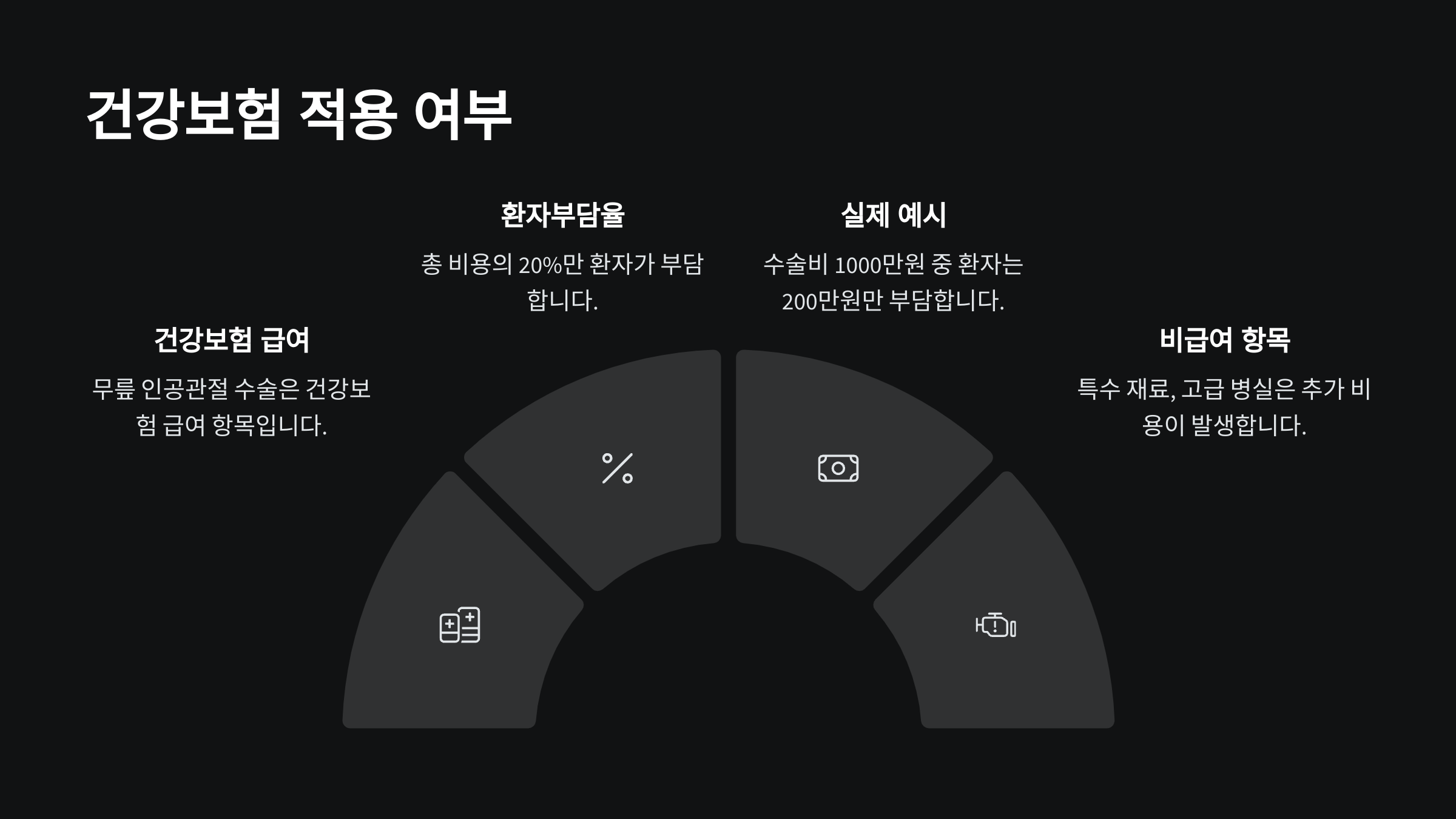 건강보험은 주로 기본형 인공관절, 일반 수술법, 표준화된 치료에 대해 적용돼요. 로봇 수술이나 고급형 재료 사용 시에는 ‘비급여 항목’으로 분류되어 본인이 전액 부담해야 해요. 그래서 수술 전 의료진과 사전에 보험 적용 여부를 반드시 상담해야 해요.