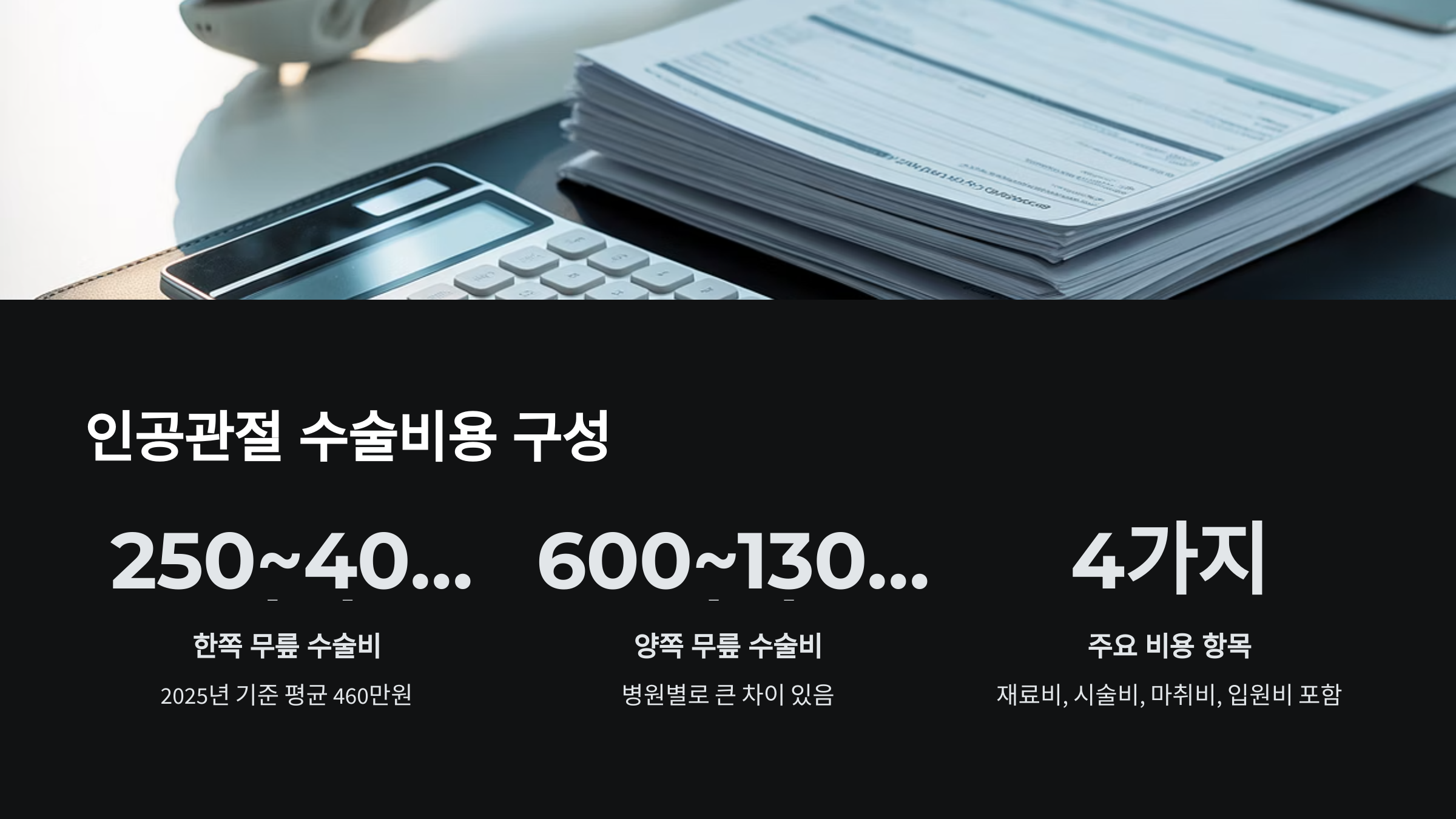 하지만 로봇 수술이나 최신 인공관절 재료를 선택할 경우 비급여 항목이 늘어나면서 비용은 1,500만 원 이상으로 올라갈 수 있어요. 특히 병원급 이상 상급종합병원에서는 의료진 수준이나 장비에 따라 수술비 차이가 커질 수밖에 없죠.