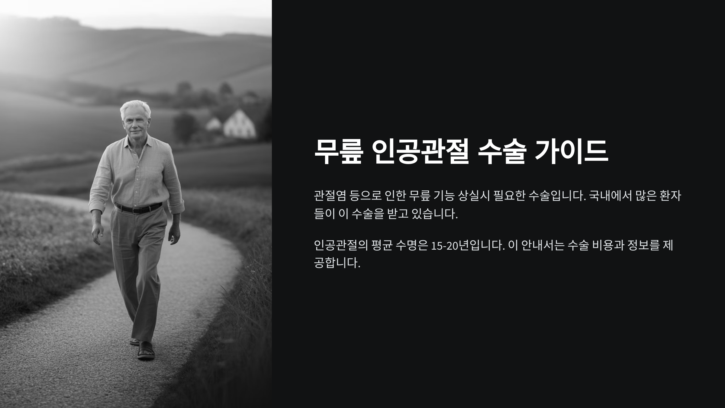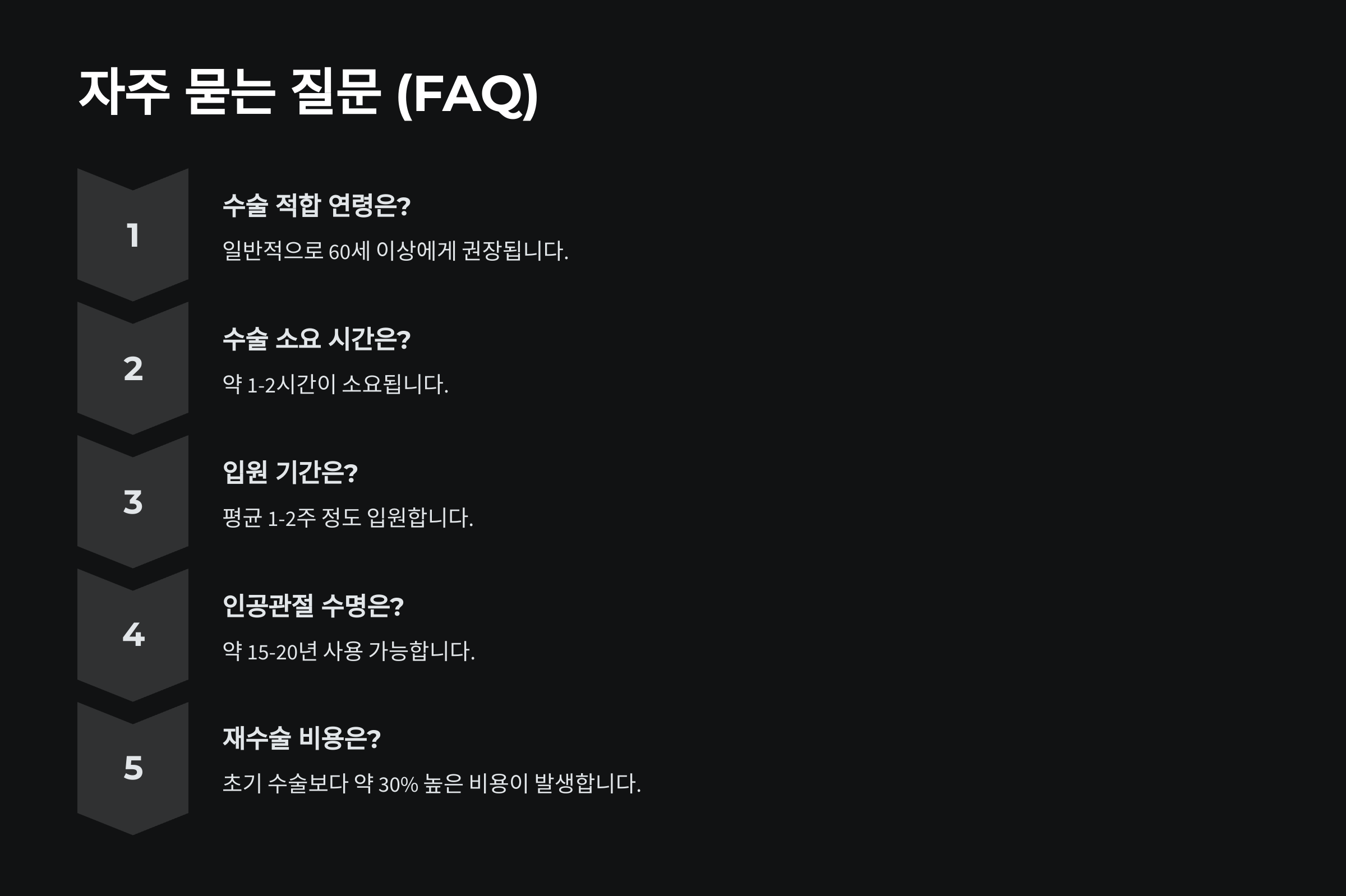 수술 종류 설명 대상 환자 회복 기간 비용 범위 전치환술 무릎 전체 관절을 교체 관절염 진행된 60세 이상 3~6개월 약 500만~800만 원 부분치환술 일부 관절만 교체 손상 부위 제한적 2~4개월 약 300만~600만 원 로봇수술 정밀한 로봇 시스템 이용 고난이도 수술, 젊은층 선호 2~4개월 약 700만~1000만 원 수술 방식에 따라 비용이 다르고, 회복 기간도 차이가 있어요. 병원과 의료진의 경험, 사용되는 인공관절의 종류에 따라 비용 차이가 크니 병원 선택이 정말 중요하죠!