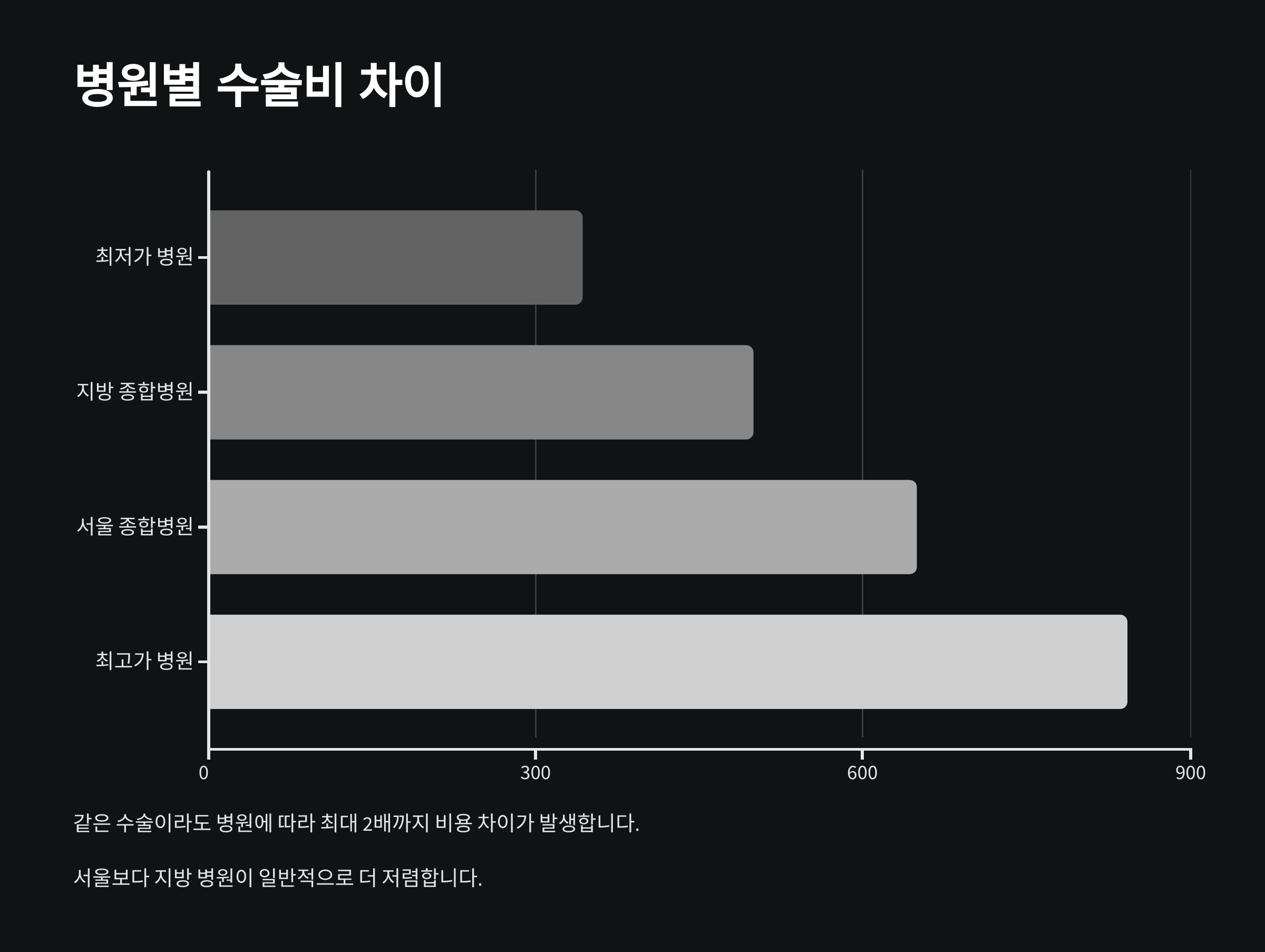 또한 진료 방식도 차이를 만들어요. 수술 전 입원 기간을 길게 두는 병원도 있고, 당일 입원 후 바로 수술하는 시스템을 가진 곳도 있어요. 병실 등급, 입원 기간, 간병 시스템까지 더해지면 같은 수술이라도 비용이 두 배 차이 나는 경우도 있답니다.
