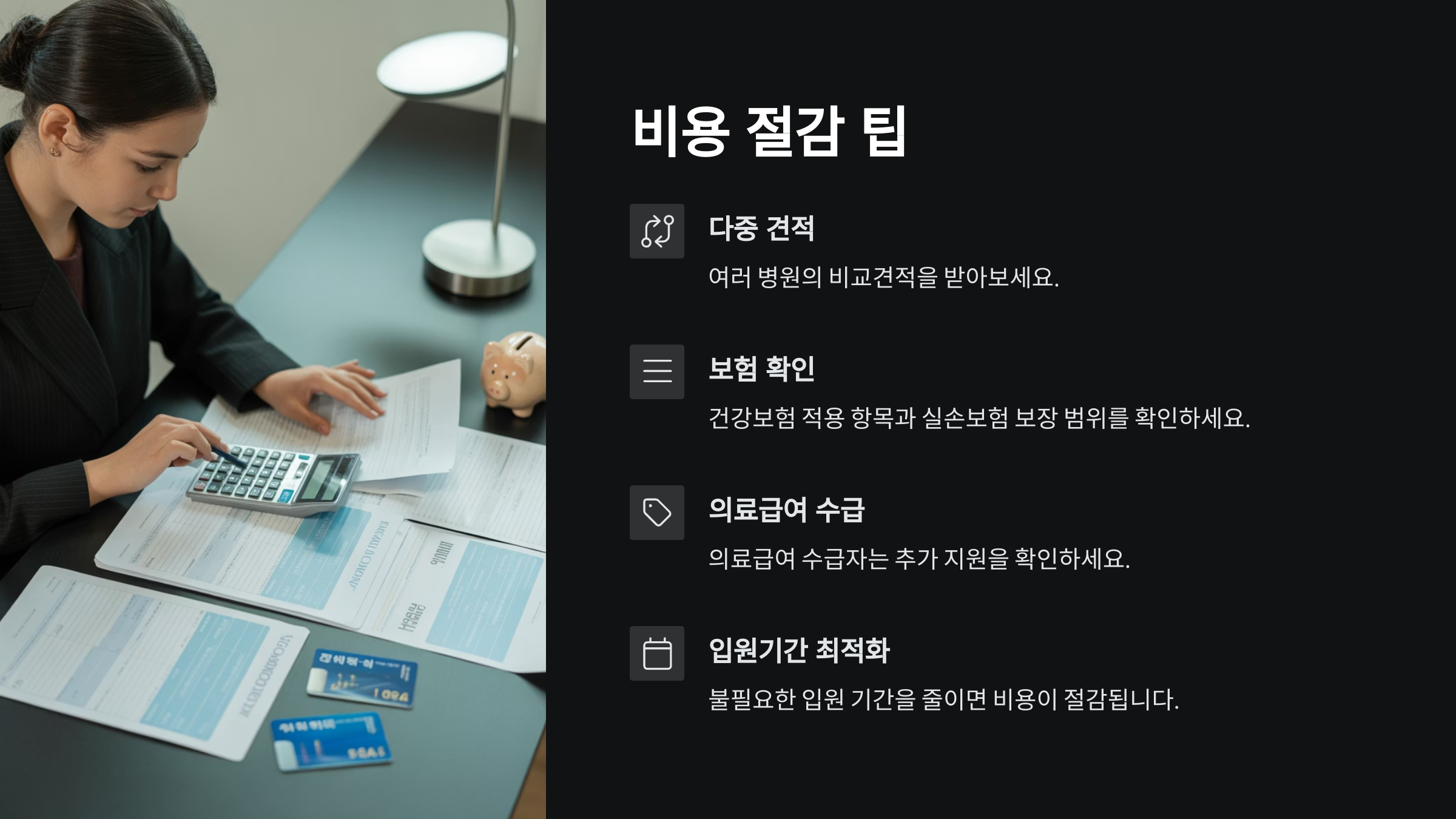 절감 팁 설명 예상 절감 효과 병원 견적 비교 2~3곳 이상 상담 최대 300만 원 실손보험 활용 보험금 청구 철저히 최대 70% 환급 재료 선택 신중히 고급형 vs 기본형 판단 최대 200만 원 공공병원 활용 공단병원/지방의료원 이용 100만 원 이상 절감 당일 입원 시스템 입원 기간 단축 병실료 절감 꼼꼼하게 준비하고 알아보면 수백만 원 절약할 수 있어요. 병원, 보험, 재료, 입원일수까지 하나씩 비교하면서 내게 맞는 선택을 해보세요! 💪