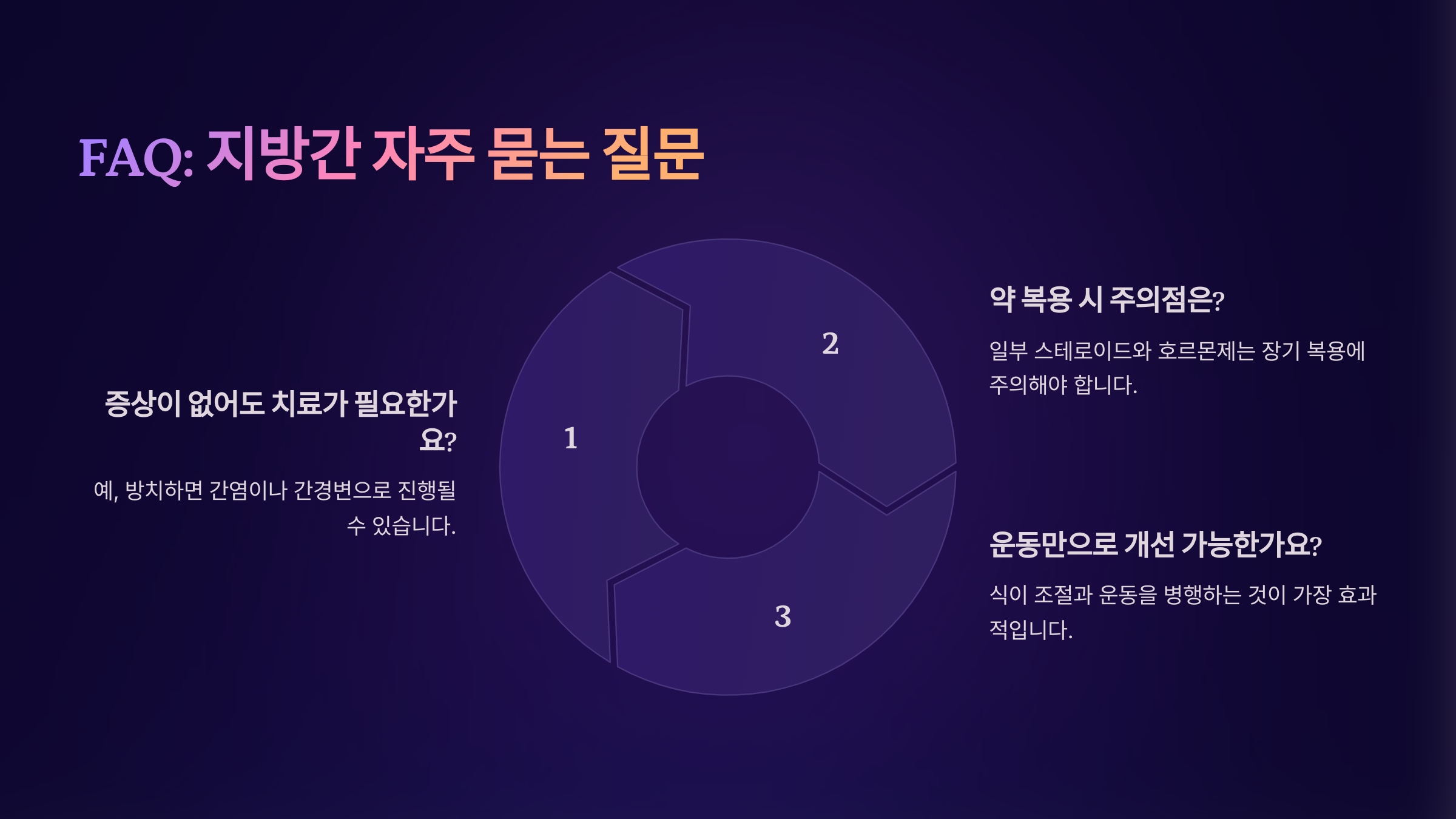 A1. 대부분의 지방간은 약 없이도 식단과 운동으로 충분히 개선될 수 있어요. 약물은 염증이나 간수치가 심할 때 사용되는 경우가 많아요.