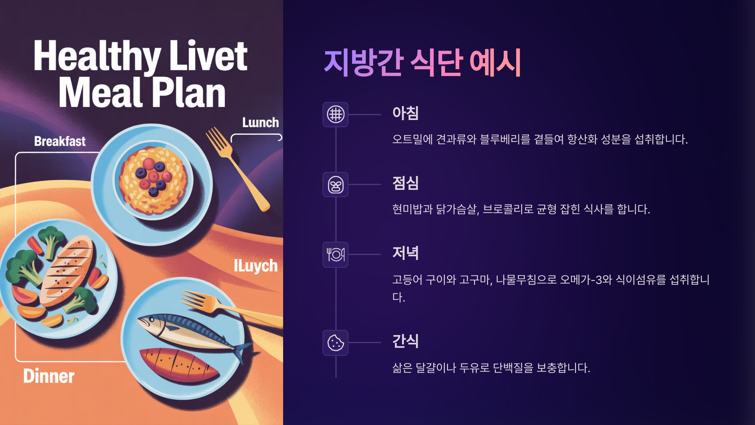 지방간 식단 예시 지방간을 관리하려면 음식 하나하나보다도 ‘하루 전체 식단 밸런스’가 중요해요. 단순히 몇 가지 음식을 골라 먹는 것이 아니라, 아침부터 저녁까지 일정한 패턴으로 영양소를 골고루 섭취하는 것이 간 건강에 훨씬 효과적이랍니다.