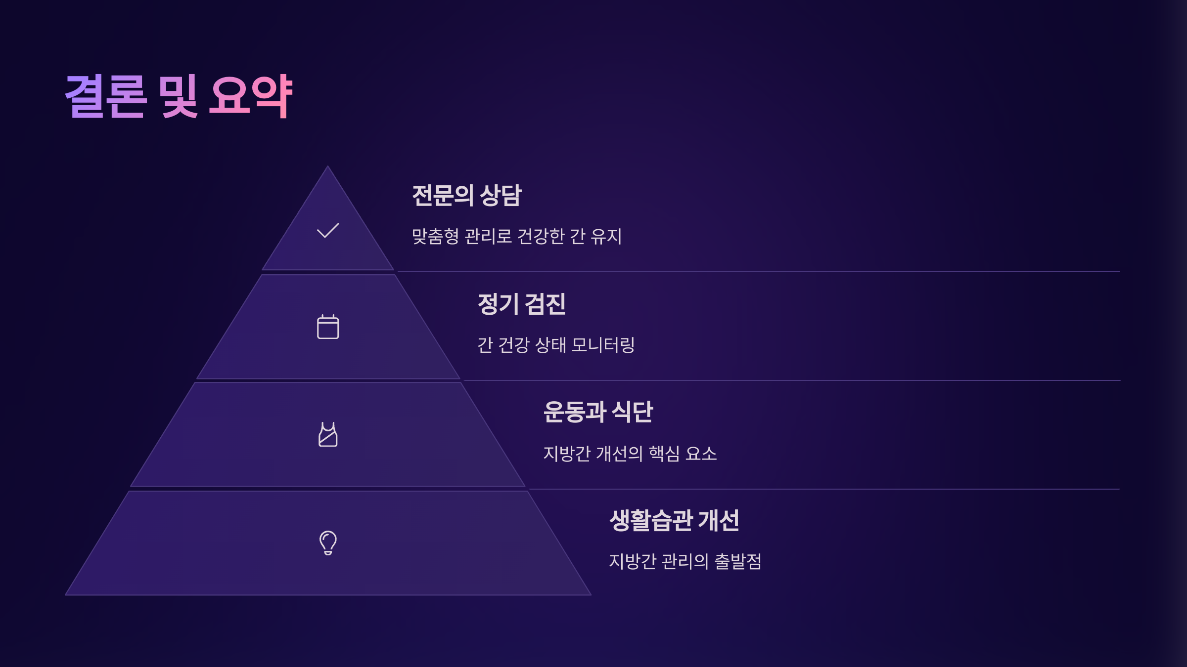 습관 효과 실천 팁 운동 지방 연소, 체중 조절 매일 걷기 30분 수면 간 해독, 피로 회복 밤 11시 이전 취침 수분 섭취 노폐물 배출, 간 정화 아침 공복에 물 1잔 스트레스 관리 호르몬 균형, 지방 축적 방지 명상, 요가, 음악 듣기 이러한 습관은 식단과 함께 실천했을 때 지방간을 근본적으로 개선해줄 수 있어요. 하루아침에 바꾸기 어렵다면, 하루에 하나씩만 실천해보세요. 작은 변화가 큰 변화를 만들어요 😊