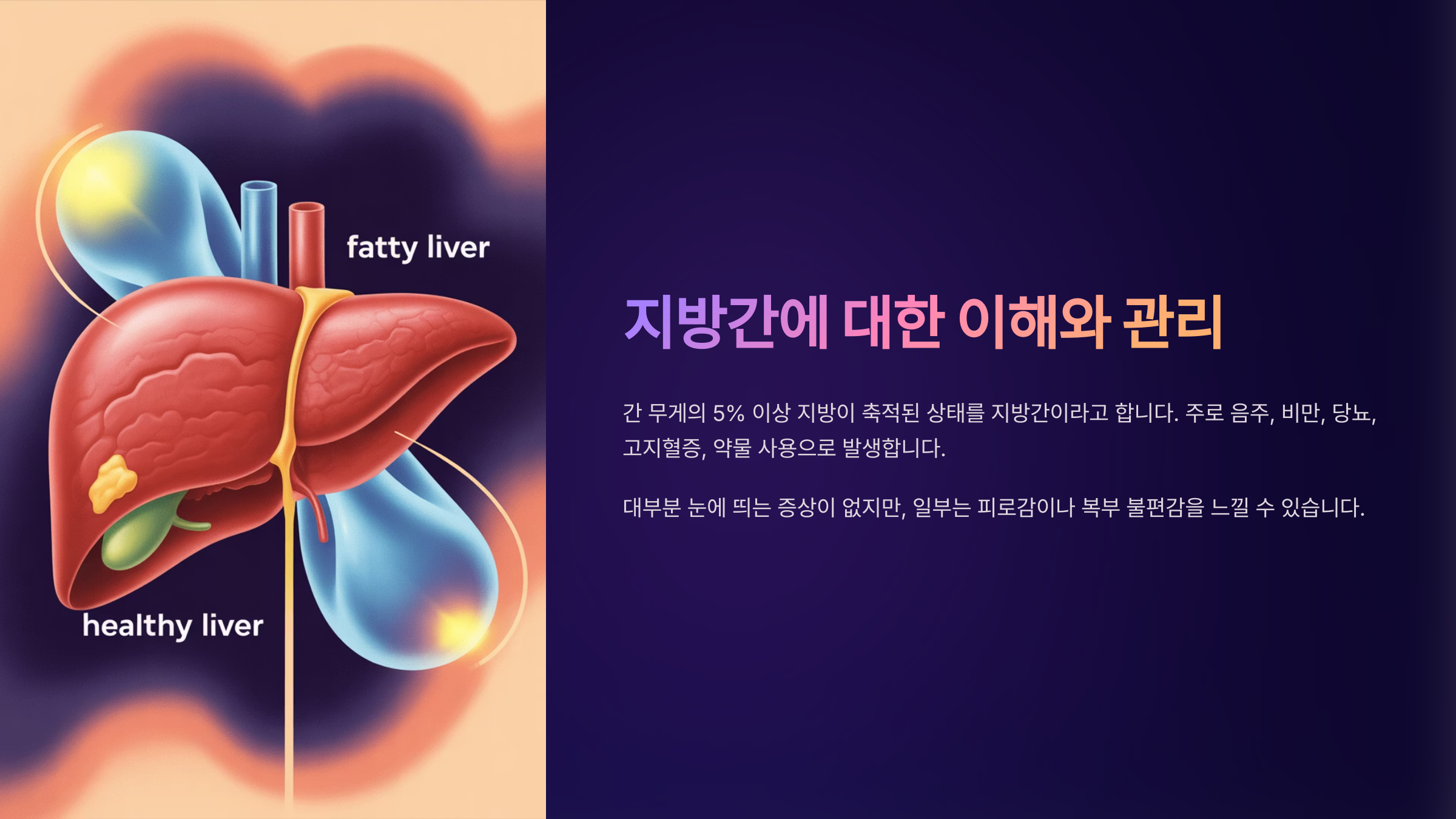 지방간이란 무엇인가요 지방간은 간세포 내에 지방이 5% 이상 축적된 상태를 의미해요. 정상 간세포에는 약간의 지방이 존재하지만, 지나치게 많이 쌓이게 되면 간 기능에 문제가 생기기 시작해요. 지방간은 크게 알코올성 지방간과 비알코올성 지방간으로 나뉘어요.