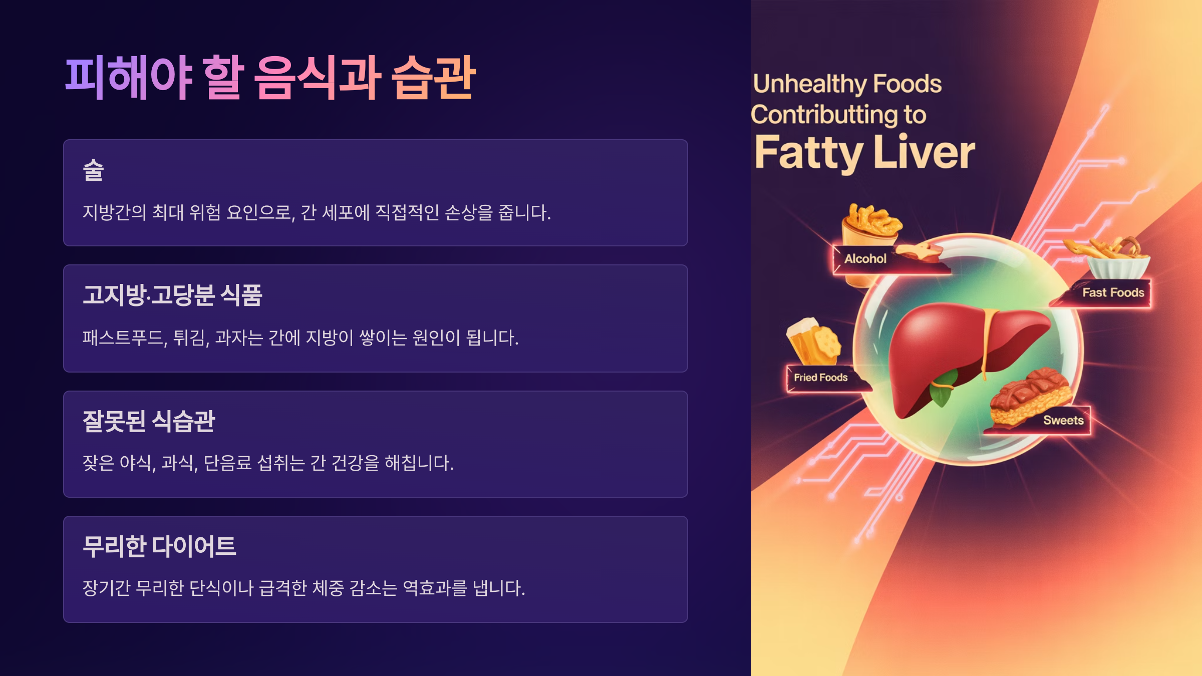 피해야 할 음식과 습관 지방간을 관리하는 데 있어 좋은 음식만큼이나 중요한 것이 바로 피해야 할 음식과 생활 습관이에요. 어떤 음식은 아무리 맛있어도 간에 큰 부담을 주고, 회복을 더디게 만들 수 있답니다.
