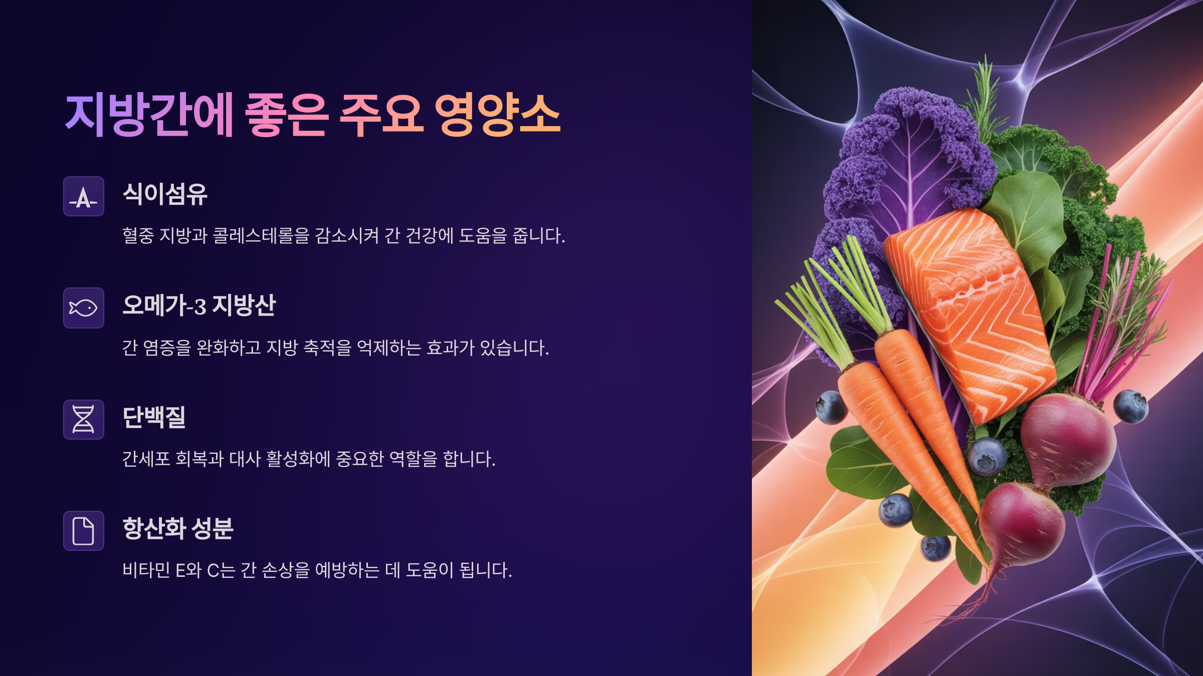 지방간에 좋은 주요 영양소 지방간을 개선하기 위해서는 특정 영양소들을 충분히 섭취하는 것이 매우 중요해요. 간 건강을 회복시키는 데 도움을 주는 영양소로는 식이섬유, 불포화지방산, 비타민 E, 오메가-3 지방산, 그리고 항산화 물질이 있어요.