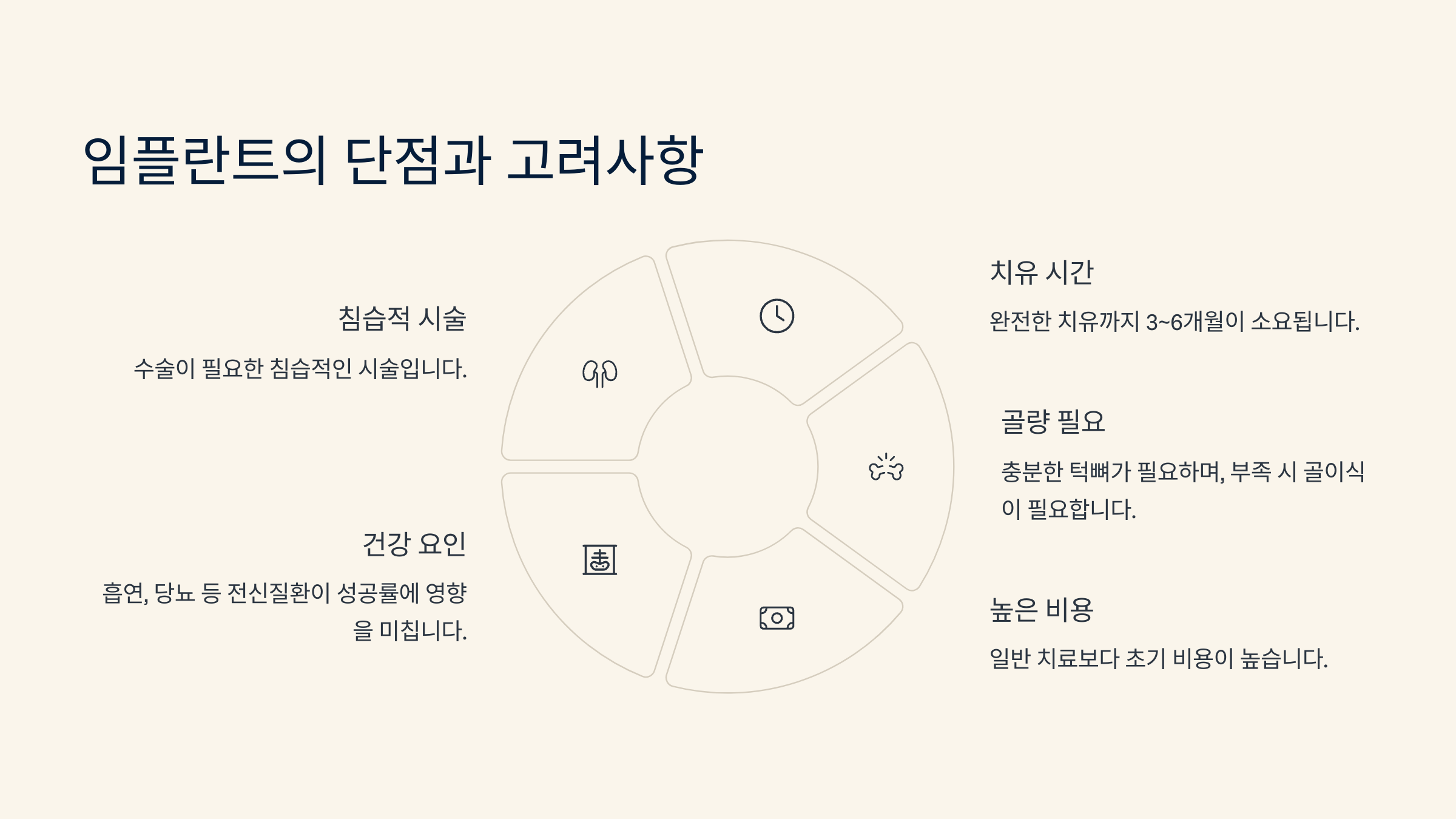 하지만 단점도 있어요. 먼저 비용이 높다는 점이에요. 기본적으로 고급 재료와 정밀한 수술이 필요하기 때문에 틀니나 브리지에 비해 비싸요. 보험이 적용되지 않는 경우 더 큰 부담이 되기도 해요.