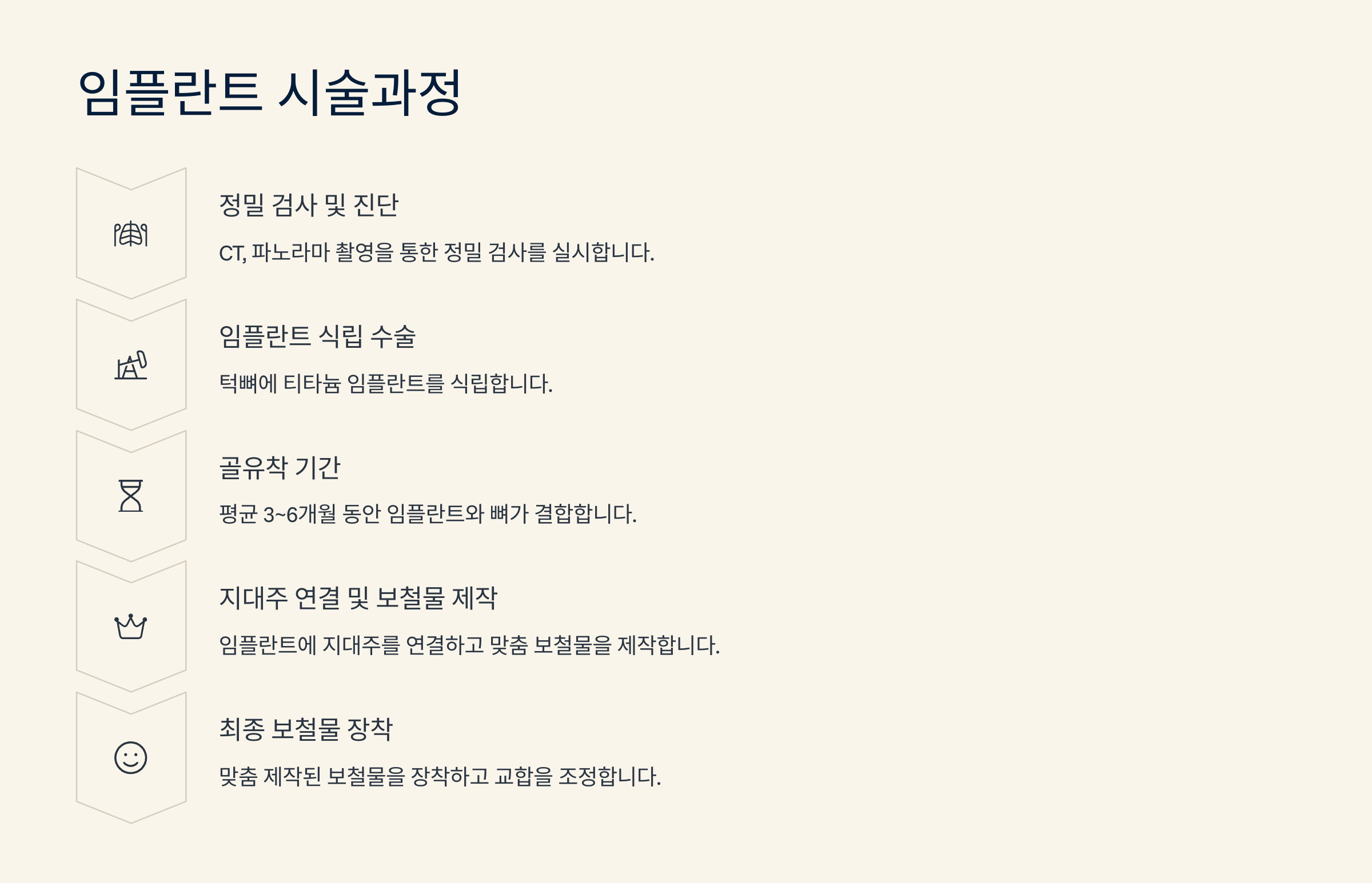 단계 내용 소요 시간 1단계 정밀 진단 및 치료 계획 수립 1일 2단계 임플란트 식립 수술 30분~1시간 3단계 골유착 기간 2~6개월 4단계 크라운 제작 및 부착 2~3주 전체 완전한 시술 완료 3~6개월 정리하자면, 임플란트는 단순히 ‘치아 하나 박는 일’이 아니에요. 나에게 맞는 계획, 철저한 준비, 섬세한 수술, 그리고 회복과 관리까지 모두 포함된 치아 재건 프로젝트라고 할 수 있어요! 🦷🚀