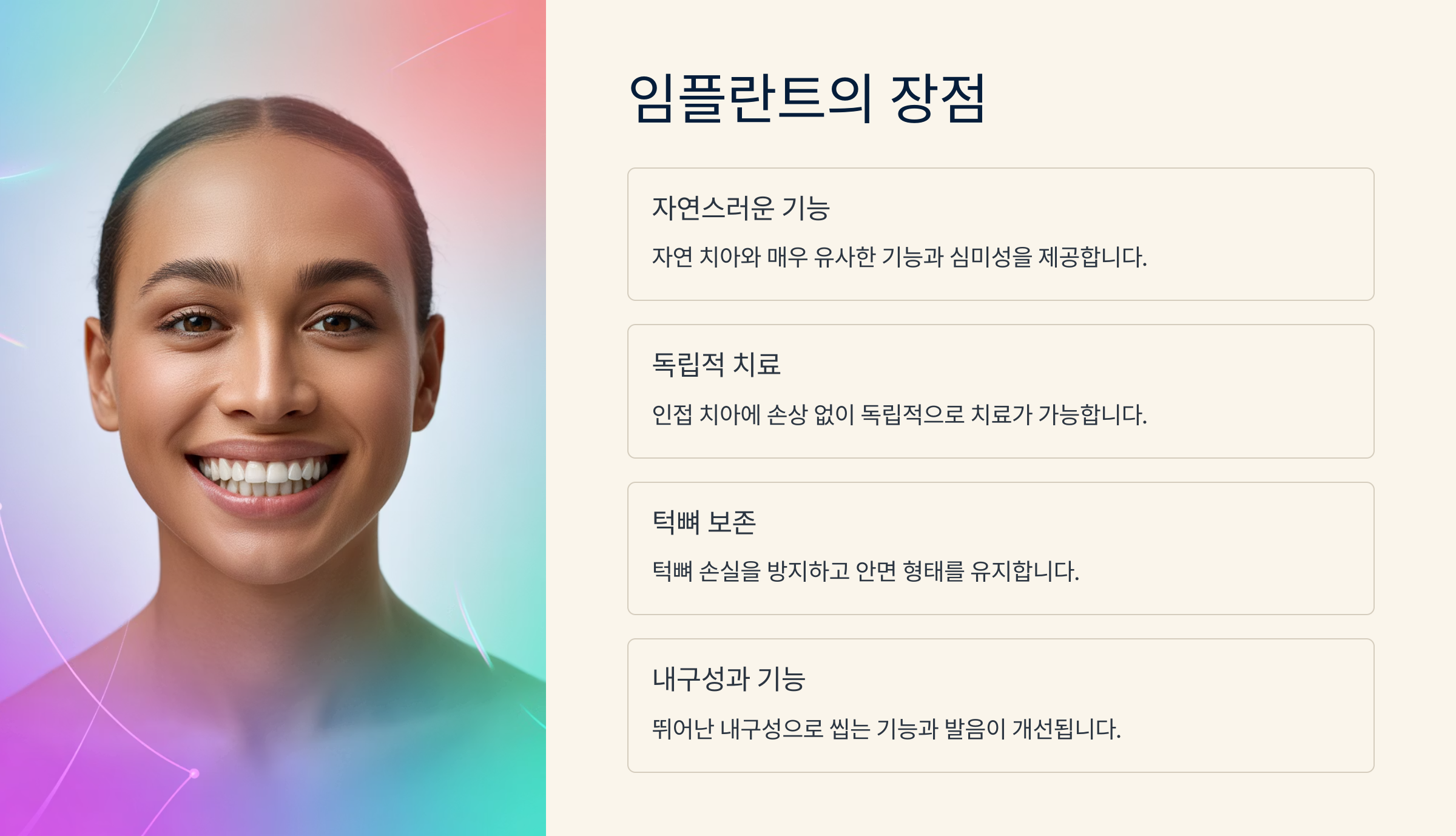 임플란트의 가장 큰 장점은 뭐니 뭐니 해도 자연치아와 비슷한 기능을 한다는 점이에요. 고정형 구조로 되어 있어서 음식물을 씹을 때 흔들리지 않고, 턱뼈에도 자극을 줘서 뼈가 흡수되는 걸 막아주는 역할을 해요. 틀니와는 비교도 안 될 정도로 자연스럽고 편하답니다.